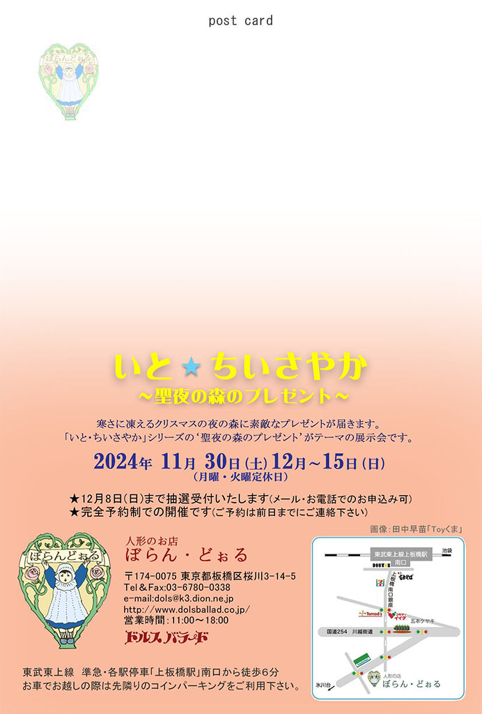 information いと ちいさやか Posted on 2024-11-30 by hikari 聖夜の森のプレゼント 2024/11/30(sat.)-12/15(sun.)11:00-18:00 ぼらん・どぉる hikari hikari の投稿をすべて表示