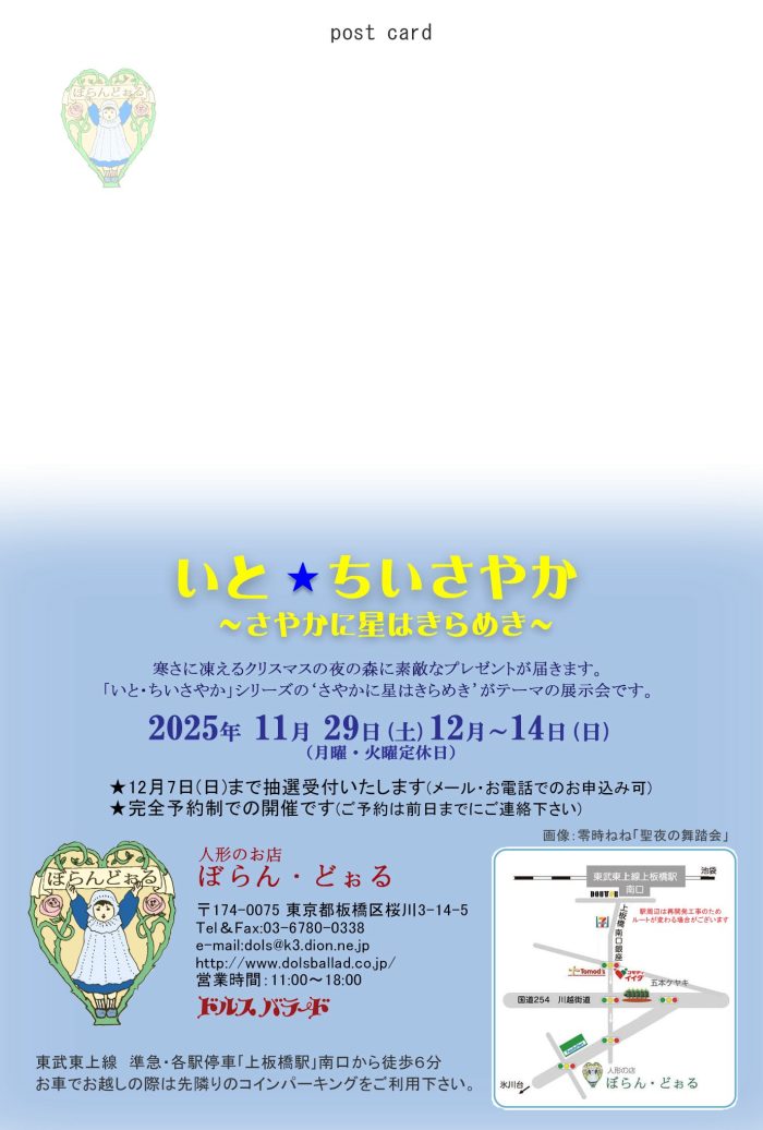 information いと ちいさやか Posted on 2025-11-29 by hikari さやかに星はきらめき 2024/11/29(sat.)-12/14(sun.)11:00-18:00 ぼらん・どぉる hikari hikari の投稿をすべて表示