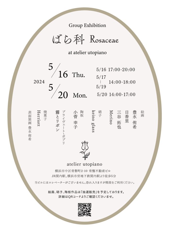 information ばら科 Rosaceae Posted on 2024-05-16 by hikari Group Exhibition2024/5/16(thu.)-5/20(mon.) atelier utopiano hikari hikari の投稿をすべて表示