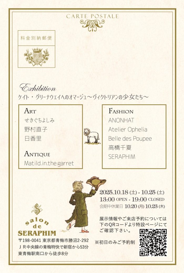 information ケイト・グリーナウェイへのオマージュ Posted on 2025-10-18 by hikari 2025.10/18(土)-10/25(土) 13:00-19:00 休業日10/20(月)10/23(木)at salon de SERAPHIM hikari hikari の投稿をすべて表示