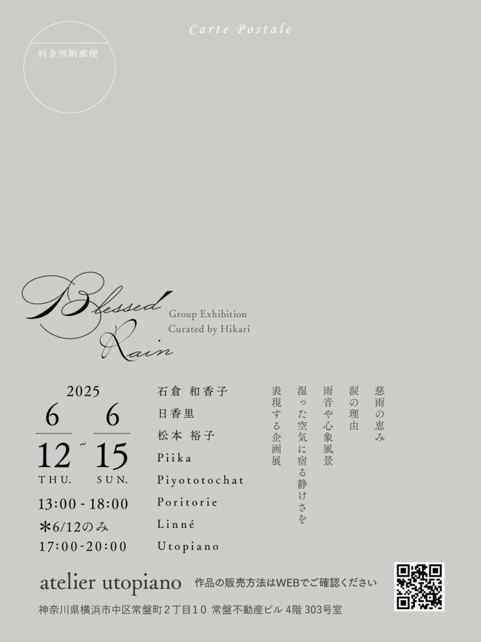 information Blessed Rain Posted on 2025-06-12 by hikari Group Exhibition日香里キュレーションの企画展2025/6/12(thu.)-6/15(mon.) atelier utopiano hikari hikari の投稿をすべて表示
