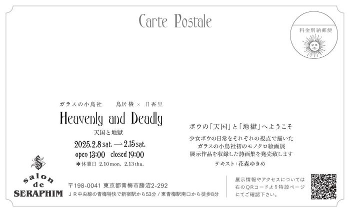 information Heavenly and Deadly Posted on 2025-02-10 by hikari ガラスの小鳥社2025.2/8(土)-2/15(土) 13:00-19:00 休業日2/10(月)13(木)at salon de SERAPHIM hikari hikari の投稿をすべて表示