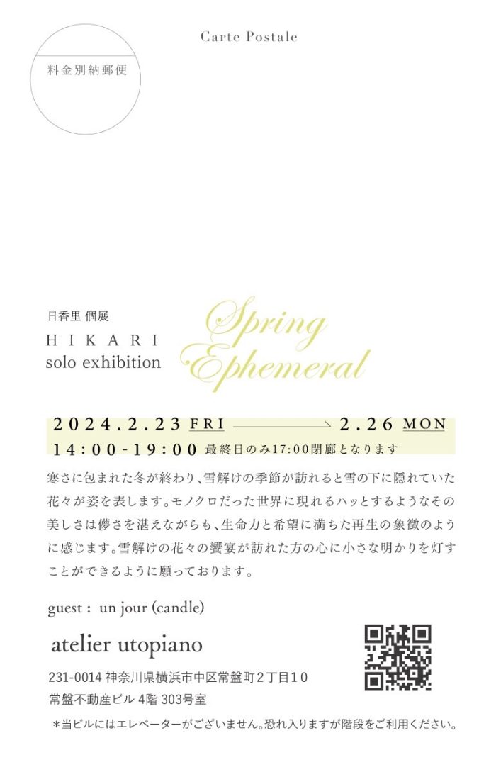 information Spring ephemeral Posted on 2024-02-23 by hikari 日香里 個展 2023/2/23(fri.)-2/26(mon.)13:00-18:00 atelier utopiano hikari hikari の投稿をすべて表示